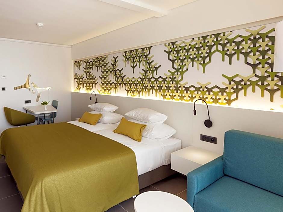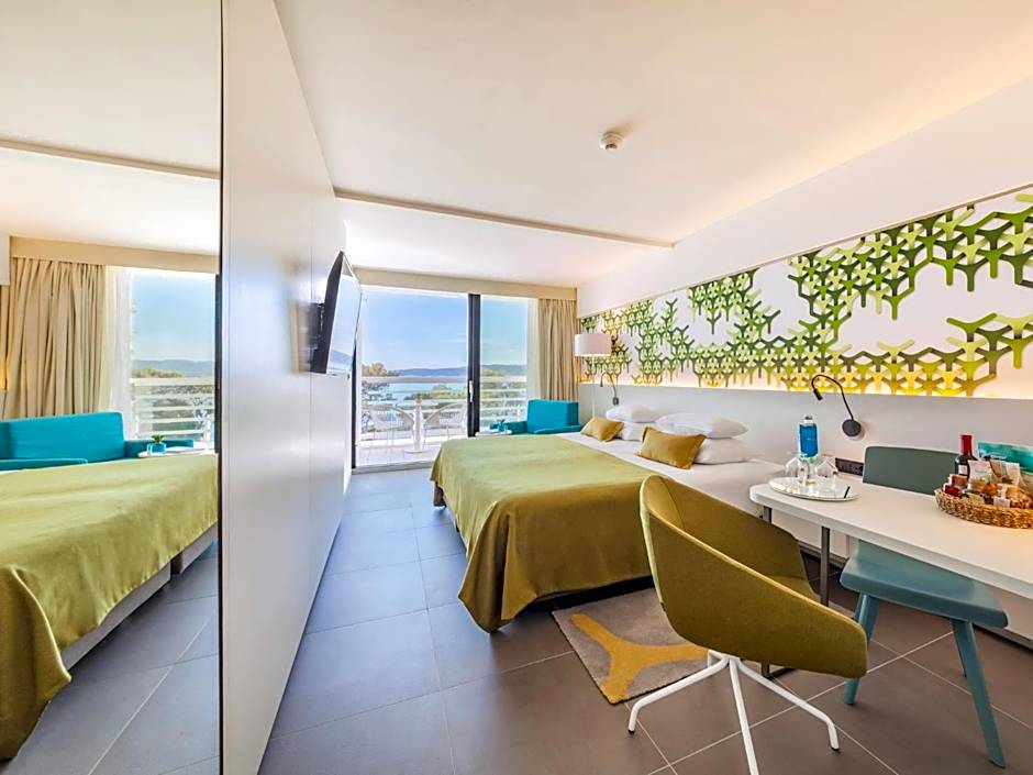Superior double room, sea side, balcony is 269 square feet and includes 2 double beds 131-150 width plus a sofa bed plus balcony.